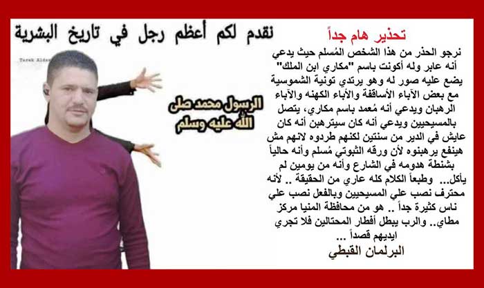 نرجو الحذر من هذا الشخص المُسلم المدعو / محمد الخضيري .. حيث يدعي أنه عابر من ظلمة الإسلام لنور المسيح .. وله أكونت باسم “مكاري ابن الملك” ..كان يضع عليه صور له وهو يرتدي تونية الشموسية مع بعض الآباء الأساقفة والأباء الكهنه والآباء الرهبان ويدعي أنه مُعمد باسم مكاري.، وللأسف هو يتصل بالمسيحيين ويدعي أنه كان سيترهبن أنه كان عايش في الدير من سنتين لكنهم طردوه لانهم مش هينفع يرهبنوه لأن ورقه الثبوتي مُسلم وأنه حالياً بشنطة هدومه في الشارع وأنه من يومين لم يأكل … وطبعاً هذا الكلام كله عاري من الحقيقة … لأنه مُحترف نصب علي المسيحيين وبالفعل نصب علي ناس كثيرة جداً .. هو من محافظة المنيا مركز مطاي.. والرب يبطل أفعال المحتالين فلا تجري ايديهم قصداً