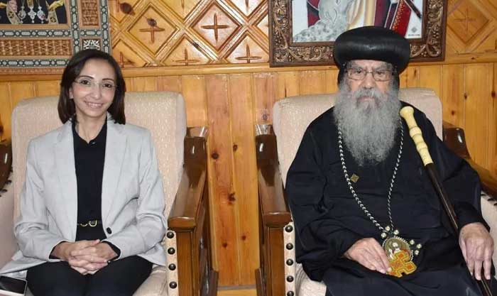 القبطية جاكلين عازر محافظ البحيرة في زيارة تهنئة للأنبا باخوميوس