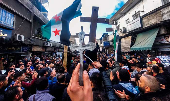 من خلال الصلاة والاحتجاج يصارع المؤمنون ليفسروا وعود القيادة الإسلامية ا الصاعدة. لجديدة سوريون مسيحيون يرفعون الصلبان واعلام عصر الاستقلال بينما يسيرون في مسيرة في منطقة الدويلعة في دمشق. لسنين طويلة لم تفكر ماريا (اننا نستخدم اسم مستعار بسبب الوضع السياسي) بلباسها ولا بكيف تقدم التحية لزملائها. كمسيحية وكموظفة حكومة قديمة كان رأسها غير مغطى ولبست لباس بيزنس عرضي غير رسمي. كانت تحيي زملائها في العمل بعبارة “صباح الخير”.