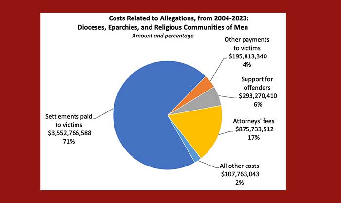 أنفقت الأبرشيات الكاثوليكية والرهبانيات الكاثوليكية أكثر من 5 مليارات دولار (!) على مزاعم الاعتداء الجنسي من عام 2004 إلى عام 2023. تم إصدار البيانات في 15 يناير من قبل مركز الأبحاث التطبيقية في الرهبنة في جامعة جورج تاون اليسوعية. ذهب ثلاثة أرباع مبلغ 5.025 مليار دولار إلى الضحايا المزعومين، و17% إلى المحامين، و6% لدعم المعتدين المزعومين، و2% إلى تكاليف أخرى. في المتوسط، دفعت شركات التأمين 16% فقط من التكاليف.