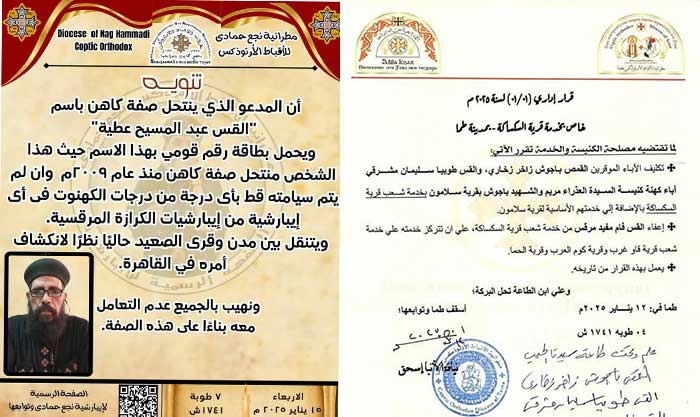 وأصدر الأنبا بضابا أسقف إيبارشية نجع حمادى بيان يحذر فيه من التعامل مع الكاهن المزيف لإنتحاله صفة كهنوتية منذ عام 2009 بينما لم يتم سيامته فى أى درجة من درجات الكهنوت على أى إيبارشية من الإيبارشيات يتنقل بين مدن وقرى الصعيد ليجمع التبرعات بعد إفتاضح أمره فى القاهرة وعلى نحو آخر ؛ أصدر الأنبا إسحق أسقف طما وتوابعها القرار الادارى رقم ١/١لسنه ٢٠٢٥ والذى كلف فيه كلا من القمص باجوش زاخر و القس طوبيا سليمان كاهنى كنيسة السيدة العذراء مريم والشهيد باجوش بقرية سلامون القماش بالخدمة والرعاية الروحية لشعب كنيسة السكساكه بجانب خدمتهم الأصلية مع إعفاء القس فام مفيد من خدمة القرية وتكليفه بالاشراف على قرية فاو غرب وكوم العرب والعما.