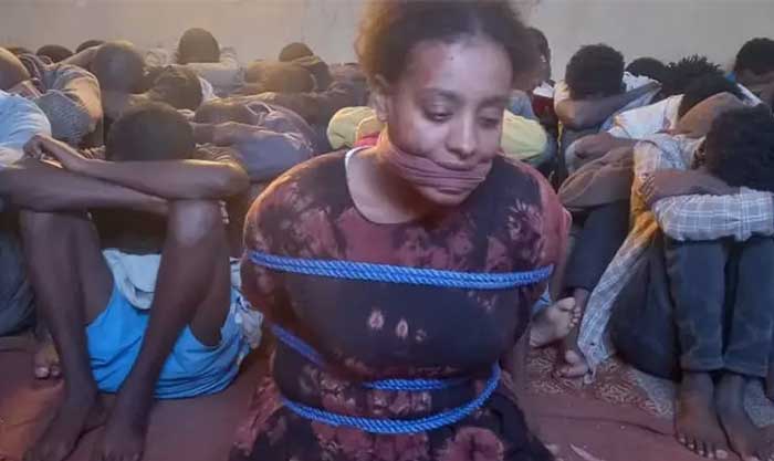 كما ظهرت في صورة أخرى وهي مكبلة وخلفها عشرات المهاجرين غير الشرعيين المحتجزين، يجلسون على الأرض في مكان مغلق ويضعون رؤوسهم بين أرجلهم في انتظار مصيرهم أو دورهم في التعذيب، في مشهد مهين. وبحسب منظمة اللاجئين في ليبيا، فإن الشابة واسمها نعيمة جمال تبلغ من العمر 20 سنة، تم اختطافها بعد وقت قصير من وصولها إلى ليبيا في شهر مايو 2024، ومنذ ذلك الحين، تعرّضت عائلتها لمطالب كثيرة من تجّار البشر.
