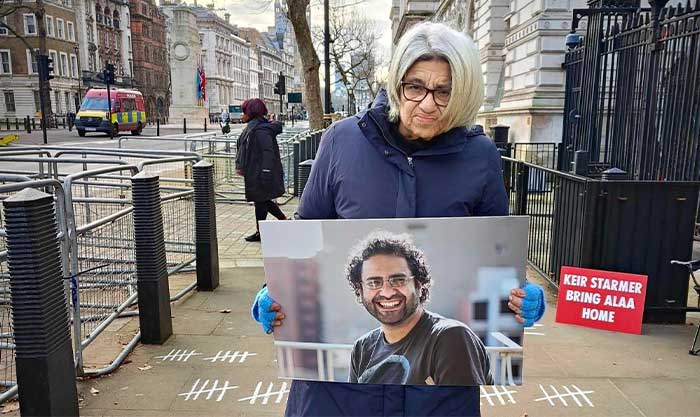 بملامح منهكة وشعر أبيض قصير وملابس شتوية وصورة لعلاء عبد الفتاح، تقف ليلى سويف والدة الناشط المصري السجين، بشكل دوري أمام مقر الحكومة البريطانية. ترفع سويف صورة نجلها وترسم على الأرض علامات بعدد أيام إضرابها عن الطعام الذي تجاوز المئة، مطالبة لندن بالتدخل للإفراج عن نجلها الذي يحمل أيضا الجنسية البريطانية.