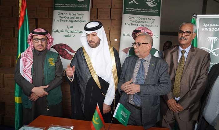 تسلمت موريتانيا أمس الثلاثاء 50 طنا من التمور هدية من المملكة العربية السعودية، وتولى تسليمها السفير السعودي في نواكشوط عبد العزيز بن عبد الله الرقابي، فيما تسلمها منه المفوض المساعد للأمن الغذائي، لمام ولد عبداوة.