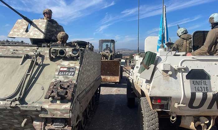 صدر عن قيادة الجيش مديرية التوجيه بيانٌ جاء فيه، “انتشرت وحدات عسكرية في بلدة عيترون – بنت جبيل في القطاع الأوسط ومناطق حدودية أخرى في منطقة جنوب الليطاني بالتنسيق مع اللجنة الخماسية للإشراف على اتفاق وقف إطلاق النار (Mechanism)، وسط تمادي العدو الإسرائيلي في اعتداءاته بما فيها حرق المنازل في عدة بلدات منها عيترون – بنت جبيل ورب ثلاثين والعديسة – مرجعيون، إلى جانب غارتَين على آليات كانت تشارك في عملية انتشال جثامين الشهداء في بلدة الطيبة – مرجعيون”.
