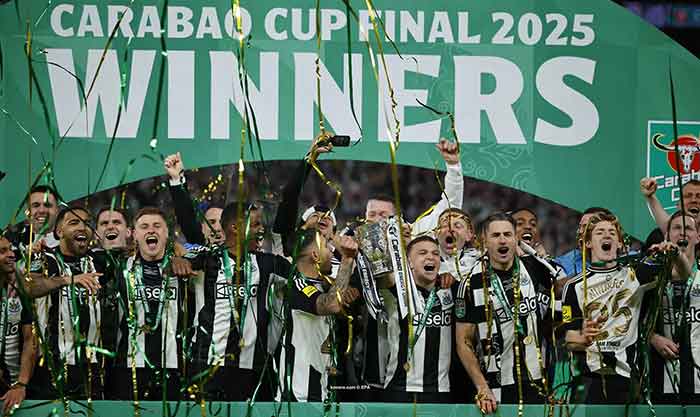 أنهى نيوكاسل يونايتد جفاف الألقاب المحلية الذي استمر 70 عاما، عندما توج بطلا لكأس رابطة الأندية الإنجليزية المحترفة مساء الأحد، بفوزه في النهائي على ليفربول 2-1 داخل ملعب “ويمبلي”.وسجل هدفي نيوكاسل كل من داني بيرن (45) وألكسندر إيزاك (53)، فيما أحرز هدف ليفربول الوحيد فيديريكو كييزا في الدقيقة 90+4.