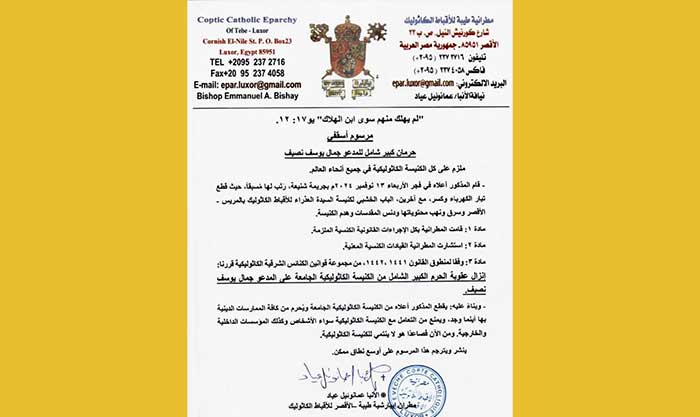 إنزال عقوبة الحرم الكبير الشامل من الكنيسة الكاثوليكية الجامعة على المدعو جمال يوسف