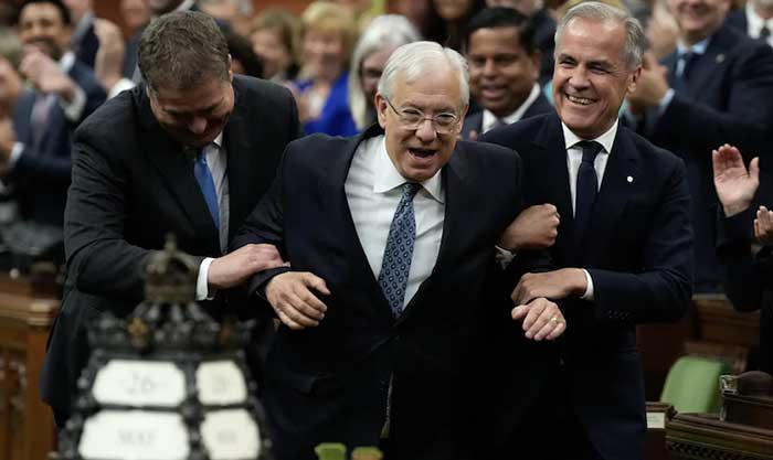 وبعد انتخاب سكارباليجيا رئيساً، قام باصطحابه إلى مقعده، انسجاماً مع التقاليد، رئيسُ الوزراء مارك كارني والزعيمُ المؤقت لحزب المحافظين في مجلس العموم أندرو شير كون زعيم الحزب بيار بواليافر لم يفز بمقعد نيابي في الانتخابات الأخيرة.