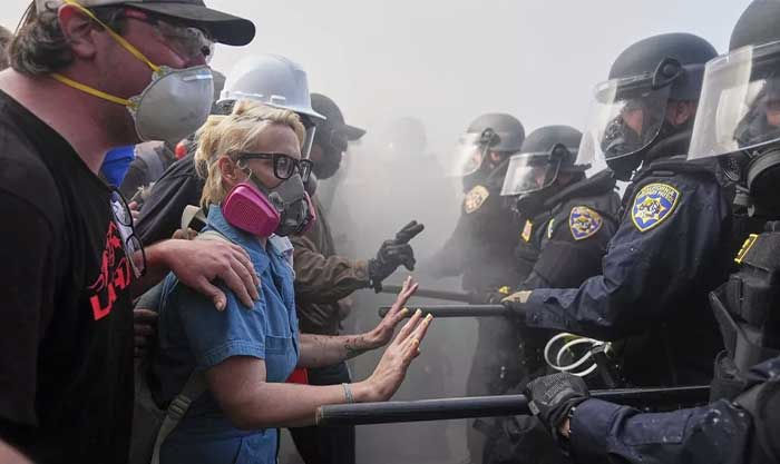 وأضاف ترامب أن المقيمين غير الشرعيين في البلاد “سيُطردون“. وشاهد فريق CNN الميداني ضباطًا يدفعون ويضربون متظاهرين بالهراوات بعد ظهر الأحد، مع تصاعد المواجهات بين المتظاهرين المحتجين على إجراءات الهجرة الفيدرالية وضباط إنفاذ القانون المنتشرين في المنطقة. ودوّت أصوات انفجارات قوية عندما أطلق الضباط قنابل صوتية في محاولة لتفريق الحشد. لوّح المتظاهرون بأعلام ولافتات كُتب عليها “أخرجوا إدارة الهجرة والجمارك من مجتمعاتنا“.