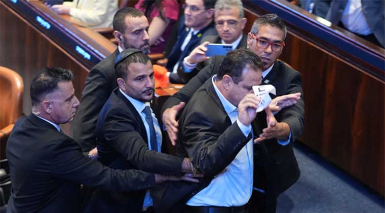 تعرض عضوان بالكنسيت الإسرائيلي، عن حزب الجبهة الديمقراطية، للطرد، اليوم الإثنين، في أثناء إلقاء الرئيس الأميركي دونالد ترمب كلمة أمام البرلمان. فبينما كان ترمب يثني على مبعوثة الخاص إلى الشرق الأوسط، ستيف ويتكوف، قائلا: „أعرف مفاوضين آخرين، وهم بارعون حقًّا، لكن بالنسبة لتحقيق السلام في الشرق الأوسط عرفت أن الجميع يحب ستيف ويحترمونه، ولو لم يشارك في هذا لكنا قد شهدنا حربًا عالمية ثالثة“، إذ قاطعه النائبان عن حزب الجبهة الديمقراطية، عوفر كسيف وأيمن عودة، مطالبين إياه بالاعتراف بدولة فلسطين، حيث رفعا لافتة مكتوب عليها „Recognize Palestine“ أو „اعترف بفلسطين“.