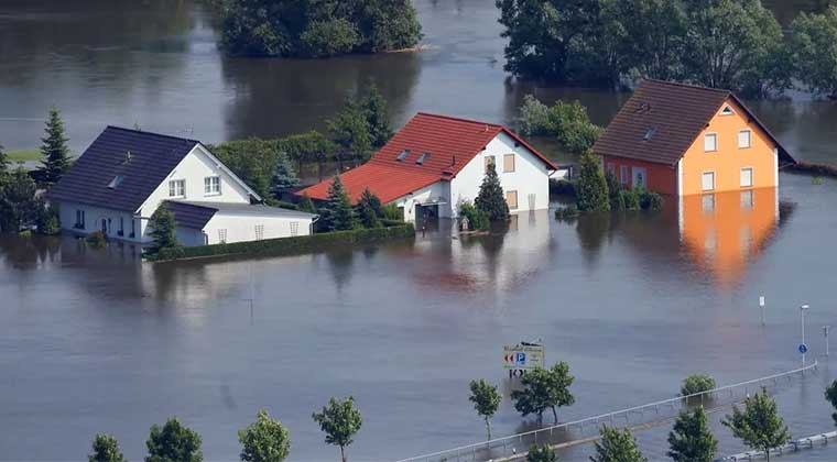 صورة جوية لمنازل تغمرها المياه جزئياً من فيضان نهر بمدينة فيشبيك بألمانيا. مفوضية الهندسة الجيولوجية الشمسية هي مجموعة من التقنيات التي تهدف إلى إخفاء بعض آثار تغير المناخ عن طريق حجب ضوء الشمس، وليست على جدول أعمال مؤتمر الأطراف الثلاثين لهذا الشهر. لكن كان ينبغي أن تكون كذلك.