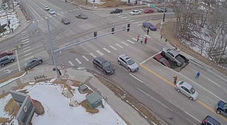 وثّق مقطع فيديو، لحظة انهيار أرضي مفاجئ عند تقاطع مروري في جنوب وسط مدينة “أوماها” بولاية “نبراسكا” الأميركية، ما أدى إلى ابتلاع مركبتين.ووقع الحادث في منطقة عصرية من المدينة، عندما هوت سيارة دفع رباعي وشاحنة بيك أب كانتا متوقفتين عند إشارة مرور داخل حفرة بعمق عدة أقدام، إثر انهيار مفاجئ في طبقة الإسفلت تحتهما.