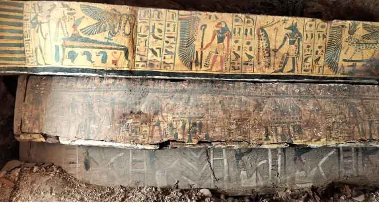 كشفت البعثة الأثرية المصريةبين المجلس الأعلى للآثار ومؤسسة زاهي حواس للآثار والتراث عن خبيئة من التوابيت الملونة بداخلها مومياوات، بالإضافة إلى مجموعة من البرديات النادرة من عصر الانتقال الثالث، وذلك أثناء أعمال الحفائر الأثرية بالزاوية الجنوبية الغربية من فناء مقبرة سنب بمنطقة القرنة بالبر الغربي بالأقصر، بحسب ما ذكره بيان نشره الحساب الرسمي لرئاسة مجلس الوزراء.