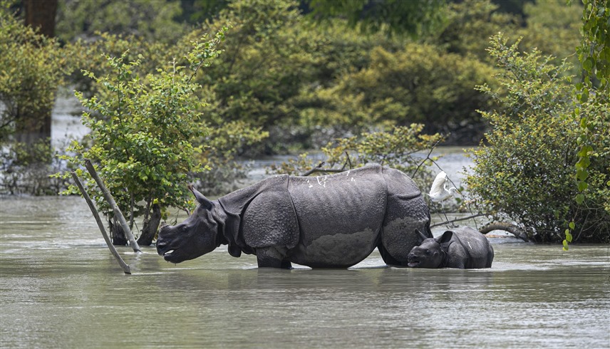 وغمرت المياه ما يقرب من ثلث أماكن إيواء الحيوانات في حديقة كازيرانغا الوطنية التي تضم تقريباً نصف عدد حيوانات وحيد القرن في العالم والتي يقدر عددها بنحو أربعة آلاف.