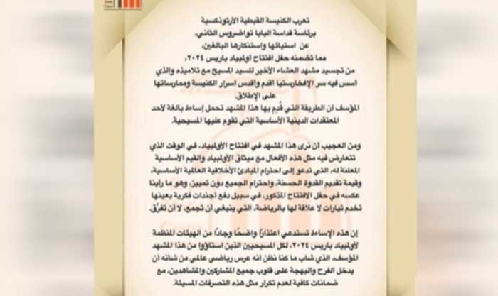 “تعرب الكنيسة القبطية الأرثوذكسية برئاسة قداسة البابا تواضروس الثاني عن استيائها واستنكارها البالغين مما تضمنه حفل افتتاح أولمبياد باريس ٢٠٢٤ من تجسيد مشهد العشاء الأخير للسيد المسيح مع تلاميذه والذي أسس فيه سر الإفخارستيا أقدم وأقدس أسرار الكنيسة وممارساتها على الإطلاق.